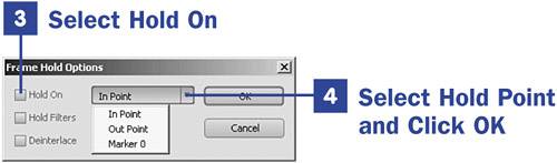 NOTES The Hold Filters option, also in the Frame Hold Options dialog box, prevents any keyframed effects that were applied to the clip from taking place. The Deinterlace option removes one field from an interlaced clip and doubles the remaining field. This option removes interlace artifacts from the freeze frame, if they exist. | 4. | Select Hold Point and Click OK