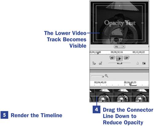 Drag the line down about half way, decreasing the opacity of the selected clip to 50%. You can set the opacity at whatever percent you desire. Notice that you do not see the opacity of the clip change in the Monitor panel until you release the mouse button. By lowering the opacity, you are making the lower clip (in this case, a title) visible. The lower the opacity of the track 2 clip, the more visible the clip on the lower track becomes.