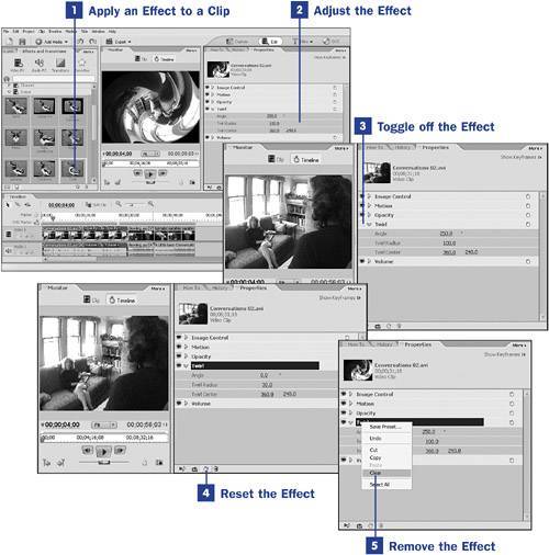 63. Reset or Remove an Effect BEFORE YOU BEGIN 58 About Preset Effects 61 Add and Customize an Effect 68 About the Properties Panel SEE ALSO 62 Rotate or Flip a Clip 65 Create and Save a Preset 67 About Keyframing 75 Control a Video Effect with Keyframes No change is permanent in nonlinear editing. This is why computer-based, nonlinear editing is often referred to as a nondestructive editing process. Everything, short of overwriting your original files, can be undone. So feel free to experiment with effects on your clips. And if you want to compare how the clip looked before and after you applied the effect, you can do so with a single click of the mouse. 1. | Apply an Effect to a Clip