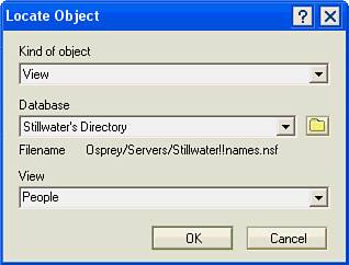 - Named Element To link to a view, a form, or a folder, use this type to specify the element. After you select Named Element from the Type field, a list field appears to the right with selections of the elements to which you can link. Select View, Form, or Folder. Below the field, click on the small folder icon to browse for the specific element you want. In the dialog box that appears (see Figure 14.9), select the Database where the element is and then select the element by name. Click OK to put that information into the Value field of the hotspot.