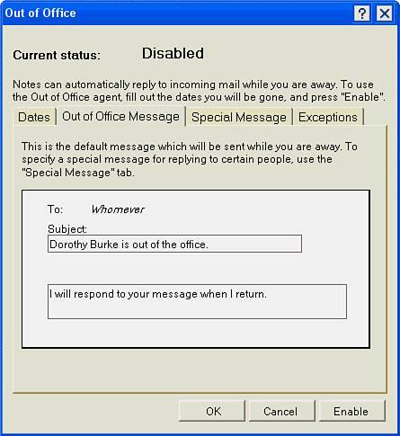 | 2. | When the Out of Office dialog box appears, click the Enable/Disable button.
