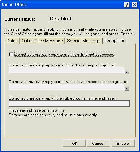 | 7. | You may be a member of an automatic mailing, to which you don't want Out of Office messages sent. Examples are notices of company meetings, or agents that search databases and notify you with automatic emails. In these cases, you might not know who will be sending the notices, and therefore you can't include them in your exclusions list. However, you can exclude notification by using words or phrases. In the Do not automatically reply if the subject contains these phrases field, enter words or phrases (such as meeting) you want Notes to look for in the subject line of incoming messages. Note that this applies only to words in the subject line of incoming messages, and that these terms are case sensitive, so you want to enter both meeting and Meeting. Note too that this does not apply to Internet mailings; for those go to step 8.