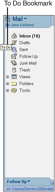 | To help keep track of all the things you have to do, create a personal To Do item. The difference between a To Do item in Notes and a Follow Up item (see Chapter 4, "Managing Mail") is that a Follow Up item flags an email as a reminder and a To Do item allows you to fill in detailed information about the item. Once created, you can view To Do items in your To Do view or optionally display them in your calendar. To access the To Do view, click the To Do bookmark as shown in Figure 11.1. Figure 11.1. The To Do view is accessed by clicking the To Do bookmark.  You can also switch to your To Do view by clicking on the word Mail in the Navigator pane of your mail database and choosing Switch to To Do from the drop-down list as shown in Figure 11.2. Figure 11.2. You can switch to your To Do view from the drop-down menu in your mail database.  Lastly, you can see the "MiniView" of your To Do view by clicking on the tab at the bottom of your Mail Views and Folders pane and selecting To Do as shown in Figure 11.3. Figure 11.3. When you click on the MiniView tab you can choose to view the To Do, Follow Up, or New Notices MiniViews.  In previous versions of Lotus Notes, To Do items were called tasks, and we tend to use these two words interchangeably throughout this book. To create a personal To Do entry, do the following: 1. | From anywhere in Notes, click the To Do bookmark on the left of your screen. The To Do view opens, as shown in Figure 11.4.