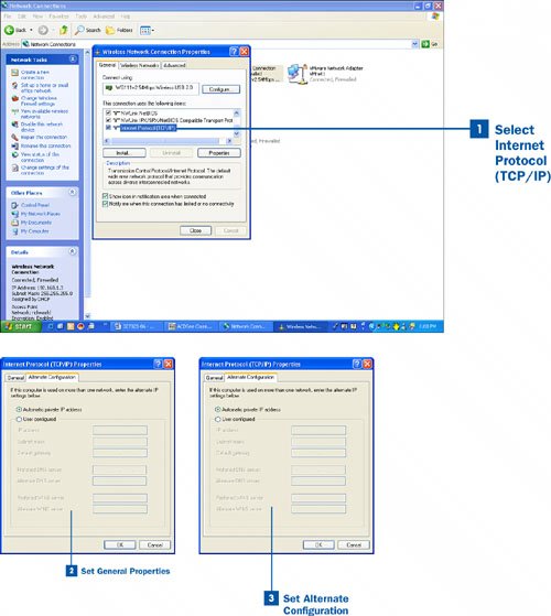 Select Internet Protocol (TCP/IP) In the Wireless Network Connection Properties dialog box for your WiFi adapter, scroll down through the list of clients, services, and protocols and select Internet Protocol (TCP/IP). Then click the Properties button. The Internet Protocol (TCP/IP) Properties dialog box opens. Set General Properties To configure the adapter as a DHCP client, select the Obtain an IP address automatically option, located on the General tab of the Internet Protocol (TCP/IP) Properties dialog box. Also select the Obtain DNS server address automatically option. Then click the Alternate Configuration tab. Note DNS stands for Domain Name Service. It is the service that translates IP addresses to "friendly" domain nameswhere friendly means "names we can easily work with." For example, when you want to go to a website such as www.samspublishing.com, you don't type the IP address (such as 130.5.62.1) in your web browser window; you type the friendly name www.samspublishing.com. DNS servers on the Web translate the friendly name to the actual IP address, and that is why you are actually able to navigate to the correct website. Because your WiFi router communicates with the broadband device from your Internet service provider, your WiFi router knows the IP addresses of the Internet service provider's DNS servers. So you should select the Obtain DNS server address automatically option when you configure TCP/IP for your adapter. The DNS server IP addresses are then provided to your computers when the WiFi router leases IP address to each of the computers. Set Alternate Configuration The Alternate Configuration tab is optional, but it can be useful if you also use the computer in Ad Hoc mode (computer-to-computer mode), which requires a fixed IP address and subnet mask. Select the User Configured option and then type an IP address and subnet mask in the appropriate boxes. You can use any of the private IP address ranges for these IP address (see About Configuring PCs for Networking). You do not have to enter the default gateway, DNS servers, or WINS servers. Only the IP addresses are needed for Ad-Hoc mode (since the Ad-Hoc connection only exists between the computers that are configured for Ad-Hoc mode). When you have finished setting the TCP/IP properties for your adapter, close the Internet Protocol (TCP/IP) Properties dialog box by clicking OK. You return to the Wireless Network Connection Properties dialog box. |
