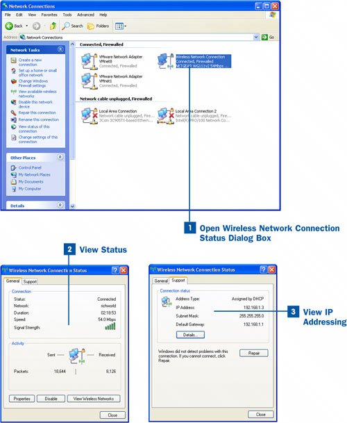 Open Wireless Network Connection Status Dialog Box In the Network Connections window (opened from the Control Panel), double-click the icon for your WiFi network connection. The Wireless Network Connection Status dialog box opens. View Status The General tab of the dialog box provides the current status of the WiFi adapter's connection as well as the duration of the connection and the current signal strength for the connection. The duration of the connection can be used to determine whether there has been a recent problem with the actual connection; the signal strength allows you to gauge how well the computer's WiFi adapter is connecting to the WiFi router's access point. Click the Support tab to open the second page of the dialog box. View IP Addressing The Support tab of the Wireless Network Connection Status dialog box shows the IP address and subnet mask assigned to the adapter by the WiFi router. It also shows the IP address of the default gateway, also known as your WiFi router (it is the gateway between your private WiFi network and the public network, the Internet). Click Close to close the dialog box. Key Terms Gateway A device that serves as an intermediary between two different types of networks. In our case, we are looking at the deviceour WiFi routerthat connects our private workgroup network with the public Internet. The WiFi router is the gateway. |
