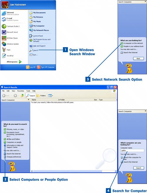 Open Windows Search Window Click the Start button and then click the Search icon on the Start menu. The Search Results window opens. Select Computers or People Option To search for computers in the workgroup, select the Computers or people link in the Search Companion pane on the left side of the Search Results window. Select Network Search Option To search for a workgroup computer, select the A computer on the network link in the Search Companion pane of the Search Results window. Search for Computer Type the name of the computer you are looking for in the Computer name text box and click the Search button. The computer's name and icon will appear in the right pane of the Search Results window if the computer is actually on and connected to the workgroup. To access the shares on this computer (its shared folders and printers), double-click the computer's icon. Note If the computer you're looking for doesn't appear in the Search Results list, there are a couple of things you can do. First, make sure that you typed the name of the computer correctly in the Computer name text box. If you remember only part of the computer's name, you can use this in the search box. If you know the first few letters of the name, type those characters. If you remember the end of the name, type an asterisk and then the remainder of the name. The asterisk acts as a wildcard for any characters that would appear before the characters provided. An asterisk can be used as a wildcard at the beginning or end of a computer name to represent any number of characters. If you need a wild card that represents a single character, use the ? (question mark). For example, if you can't remember whether the computer's name is bill or bull, use the search term b?ll. Also make sure that the computer is actually on and connected to the network. If you still can't see the computer, check whether the computer is actually a member of the workgroup (use the System Properties dialog box on that computer to check its workgroup affiliation; right-click the My Computer icon to open the System Properties dialog box). If all settings seem to be correct and you still cannot see the computer on the network, take a look at Chapter 13, "Troubleshooting and Monitoring Network Connections." |