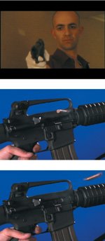 Figure 14.5. A shell pops off of the fired handgun. Note that the shell appears only as a blurred, elongated white element in frame with no discernable detail. A blue-screen shot of an automatic weapon shows a much more discernable shell. (Images courtesy The Orphanage and Artbeats.)