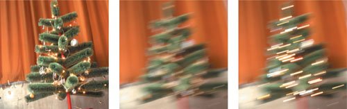 In the Figures 11.12a, b, and c, each of the bright Christmas tree lights is severely clipped when shown in video space, which is not a problem so long as the image is only displayed, not adjusted. 11.12b is the result of following the rules by converting the image to linear before applying a synthetic motion blur. Indeed, the lights are creating pleasant streaks, but their brightness has disappeared. In 11.12c the HDR image is blurred in 32 bit per channel mode, and the lights have a realistic impact on the image as they streak across. Even stretched out across the image, the streaks are still brighter than 1.0. Considering this printed page is not high dynamic range, this example shows that HDR floating point pixels are a crucial part of making images that simulate the real world through a camera, no matter what the output medium.