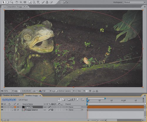 Figure 12.8. Reference of film footage that was shot and processed with a vignette, and addition of the equivalent vignette effect in After Effects. Double-click the Elliptical Mask tool to fill the frame, then open the mask controls (MM), check Invert, and set a high Mask Feather (500 for this 2K resolution source).