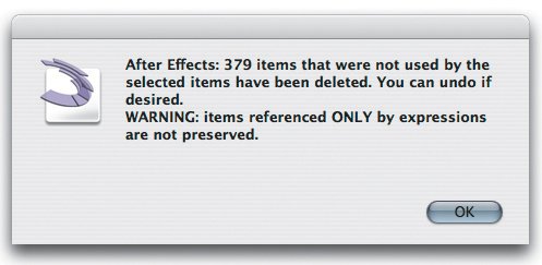 Figure 1.13. Do not be alarmed. After Effects is merely reminding you that the Reduce Project operation will remove items from the project (but not actually delete them from the source disk). The extra warning regarding expressions is pertinent only if you have linked a property's expression to a separate composition that is not otherwise used (a somewhat rare case).