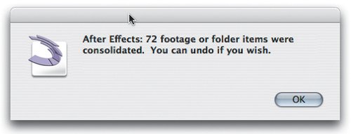 Figure 1.14. A similar warning appears when you choose File > Consolidate Footage, which looks for duplicate instances of the same source file in the project and chooses the first of these (in top-to-bottom order in the Project panel) to represent all instances.