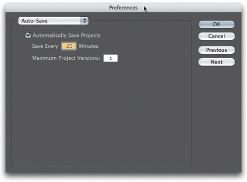 New with version 7.0 is the Project Auto-Save option. You won't find this option in the File menu with the other save options; instead, you control it via Preferences > Auto-Save, where it is toggled off by default (Figure 1.15). Check the box marked Automatically Save Projects and specify the period of time between automatic saves.