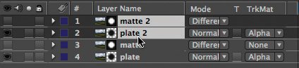 Figure 3.38. A basic alpha track matte setup: The alpha of layer 1 is set as the alpha of layer 2 via the highlighted pull-down menu. The small icons just to the left of the layer names help remind you that this relationship has been set up, and which is the color layer and which is the matte.