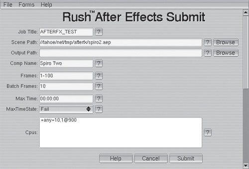 Figure 4.16. Rush Render Queue may not have a pretty front-end, but it's pretty sophisticated; This Submit panel allows you to specify which boxes will pick up the render, at what priority, how many to use, and how much time to give each of them to render before timing out. At big studios, this is indispensable.