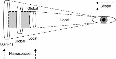 When a function call is made during execution, the third, a local, namespace is created. We can use the globals() and locals() built-in functions to tell us which names are in which namespaces. We will discuss both functions in more detail later on in this chapter. 12.3.1. Namespaces versus Variable Scope Okay, now that we know what namespaces are, how do they relate to variable scope again? They seem extremely similar. The truth is, you are quite correct. Namespaces are purely mappings between names and objects, but scope dictates how, or rather where, one can access these names based on the physical location from within your code. We illustrate the relationship between namespaces and variable scope in Figure 12-1. Figure 12-1. Namespaces versus variable scope  Notice that each of the namespaces is a self-contained unit. But looking at the namespaces from the scoping point of view, things appear different. All names within the local namespace are within my local scope. Any name outside my local scope is in my global scope. Also keep in mind that during the execution of the program, the local namespaces and scope are transient because function calls come and go, but the global and built-ins namespaces remain. Our final thought to you in this section is, when it comes to namespaces, ask yourself the question, "Does it have it?" And for variable scope, ask, "Can I see it?" 12.3.2. Name Lookup, Scoping, and Overriding So how do scoping rules work in relationship to namespaces? It all has to do with name lookup. When accessing an attribute, the interpreter must find it in one of the three namespaces. The search begins with the local namespace. If the attribute is not found there, then the global namespace is searched. If that is also unsuccessful, the final frontier is the built-ins namespace. If the exhaustive search fails, you get the familiar: >>> foo Traceback (innermost last): File "<stdin>", line 1, in ? NameError: foo Notice how the figure features the foremost-searched namespaces "shadowing" namespaces, which are searched afterward. This is to try to convey the effect of overriding. This shadowing effect is illustrated by the gray boxes in Figure 12-1. For example, names found in the local namespace will hide access to objects in the global or built-ins namespaces. This is the process whereby names may be taken out of scope because a more local namespace contains a name. Take a look at the following piece of code that was introduced in the previous chapter: def foo(): print "\ncalling foo()..." bar = 200 print "in foo(), bar is", bar bar = 100 print "in __main__, bar is", bar foo() When we execute this code, we get the following output: in __main__, bar is 100 calling foo()... in foo(), bar is 200 The bar variable in the local namespace of foo() overrode the global bar variable. Although bar exists in the global namespace, the lookup found the one in the local namespace first, hence "overriding" the global one. For more information regarding scope, see Section 11.8 of Chapter 11. 12.3.3. Namespaces for Free! One of Python's most useful features is the ability to get a namespace almost anywhere you need a place to put things. We have seen in the previous chapter how you can just add attributes to functions at whim (using the familiar dotted-attribute notation): def foo(): pass foo.__doc__ = 'Oops, forgot to add doc str above!' foo.version = 0.2 In this chapter, we have shown how modules themselves make namespaces and how you access them in the same way: mymodule.foo() mymodule.version Although we will discuss object-oriented programming (OOP) in Chapter 13, how about an example even simpler than a "Hello World!" to introduce you to Python classes? class MyUltimatePythonStorageDevice(object): pass bag = MyUltimatePythonStorageDevice() bag.x = 100 bag.y = 200 bag.version = 0.1 bag.completed = False You can throw just about anything you want in a namespace. This use of a class (instance) is perfectly fine, and you don't even have to know much about OOP to be able to use a class! (Note: These guys are called instance attributes.) Fancy names aside, the instance is just used as a namespace. You will see just how useful they are as you delve deeper into OOP and discover what a convenience it is during runtime just to be able to store temporary (but important) values! As stated in the final tenet of the Zen of Python: "Namespaces are one honking great idealet's do more of those!" (To see the complete Zen, just import the this module within the interactive interpreter.) |
