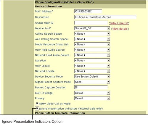 The Ignore Presentation Indicators check box, introduced in CallManager 4.1, gives you the flexibility to overrule internal caller ID restrictions on a device-by-device basis. To activate this check box, access the IP Phone where you want to remove caller ID restrictions and place a check in the Ignore Presentation Indicators (Internal Calls Only) check box, shown in Figure 17-17. When this feature is active, the following caller ID modifications take place: