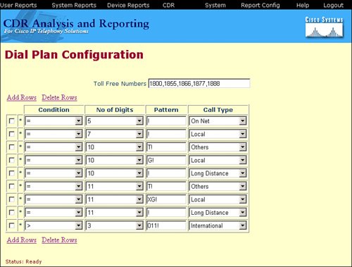 The default dial plan in CAR specifies the NANP, as shown in Figure 33-6. To configure the dial plan, define the parameters for outgoing call classifications. Call classifications include International, Local, Long Distance, On Net, and Others. For example, if local calls in the area are six digits in length, specify a row in the dial plan as follows: