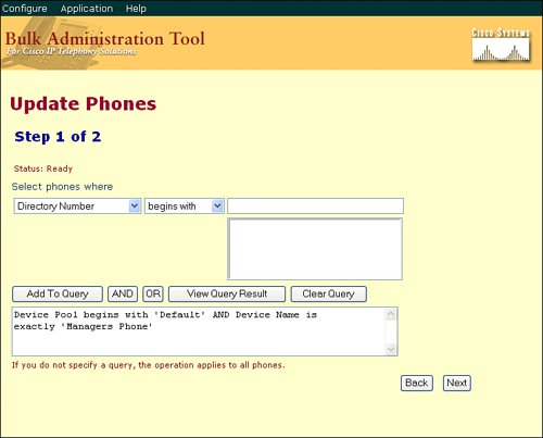 After you discover the Cisco BAT utility, it will quickly become your new best friend for most day-to-day administration of the IP telephony network. Although there will always be individual changes to the voice network, such as adding a phone extension or a new user, most of the changes you will perform will need to occur in bulk. For example, the accounting department needs different hold music or the department managers need specialized calling restrictions. You can attack these types of tasks one device at a time (which can quickly become tedious and time consuming) or with a few mouse button clicks using the Cisco BAT.