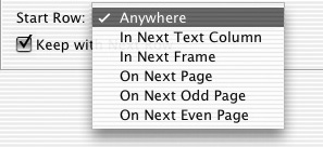 Anywhere lets the row start anywhere in a text frame. In Next Text Column forces the row to the next column in the frame or the next text frame. In Next Frame forces the row to the next text frame. On Next Page forces the row to the next page. On Next Odd Page forces the row to the next odd-numbered page. On Next Even Page forces the row to the next even-numbered page.