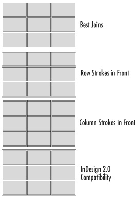 Best Joins lets InDesign create the best possible appearance for how the strokes intersect. Row Strokes in Front moves the strokes for the rows in front of the strokes for the columns. Column Strokes in Front moves the strokes for the columns in front of the strokes for the rows. InDesign 2.0 Compatibility uses a combination of the Best Joins for the table border and the rows in front of the strokes for the interior cells.