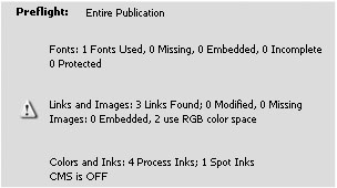 The Summary area of the Preflight dialog box gives you an overview of the categories checked during a preflight.  Tip Any potential printing problems are flagged with an alert symbol in the Preflight Summary. | 3. | Click each of the categories in the Preflight dialog box . (See the following exercises for details on these categories.)