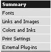 | You should also check the colors and inks to make sure that the right number of colors print. To review the Colors and Inks information: You can also look at the Print Settings for a complete list of all the print settings currently applied to the document. To review the Print Settings information: You can also look to see if any external plug-ins were used in creating the document. You may need to alert your print shop that these plug-ins are necessary for outputting the document. Tip You don't need to worry about the plug-ins unless you have installed any special third-party plug-ins. To review the external plug-ins information: - Choose External Plug-ins from the categories on the left of the Preflight dialog box. This shows any third-party plug-ins that have been installed