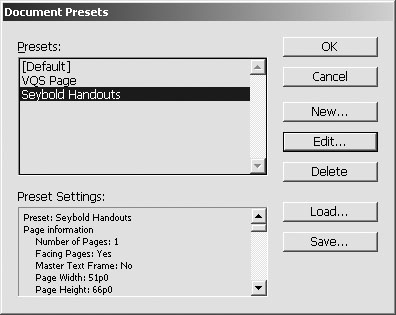 | You may want to save all the settings for certain types of documents so they can easily be applied when you start new documents. For instance, my Visual QuickStart books require different settings than the handouts I use when teaching. Document presets make it easy to apply the different settings when I create new documents. To save the document settings as document preset: 1. | Choose File > New > Document and set the options in the New Document dialog box.