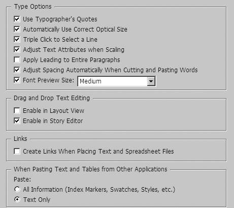 | The Type preferences (see page 529) control the settings for selecting and formatting text, dragging and droping text, linking imported text, and pasting text. |