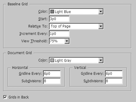 | The Grids options (see page 535) let you set the colors and increments for the baseline grid and the document grid. |