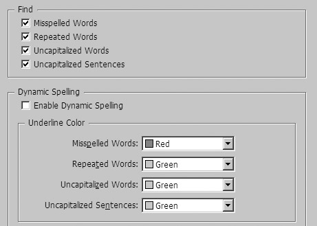 | The Spelling preferences (see page 540) let you refine which problems are found during a spell check and control how the dynamic spelling options work. |