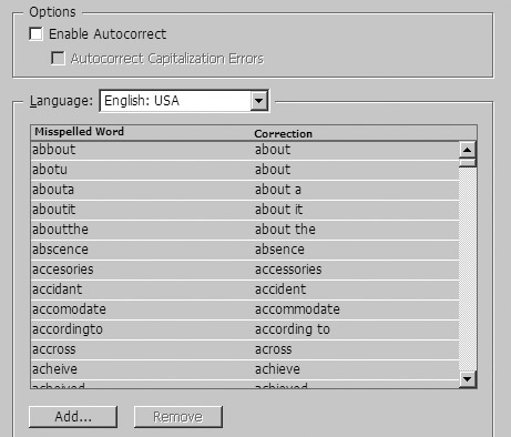 | The Autocorrect preferences (see page 541) let you control which words will be automatically corrected as you input text. |