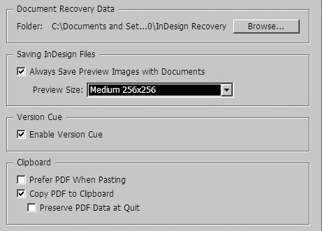 | The File Handling preferences (see page 546) control where backup and saved data are located. It also lets you turn Version Cue on, control how previews are created, and set the type of information stored when you copy objects to the clipboard. |