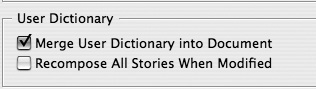 The Language controls in the Dictionary category.  To set the user dictionary preferences: 1. | Merge User Dictionary into Document adds the hyphenation exceptions in the user dictionary to the document. This is on by default.