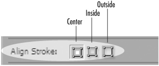 Examples of how the Align Stroke controls change the position of the stroke on the path.  Center aligns the stroke so that half the stroke weight is inside the path and half is outside the path. Inside aligns the stroke so that the entire thickness of the stroke weight is inside the path. Outside aligns the stroke so that the entire thickness of the stroke weight is outside the path. | Uses for the Stroke Alignment Most people will find they don't ever need to change the alignment options for a stroke. They use the traditional Center alignment all the time. However, for many others, the ability to specify where the stroke aligns on the path is a real benefit. Say you have a placed image inside a frame (see Chapter 8 "Imported Graphics," for more information on working with imported graphics). After you import the graphic, you may want to add a stroke to its frame, but you don't want the stroke to cover any part of the placed image. If you applied a stroke with the traditional Center alignment, you would then have to enlarge the size of the frame by half the size of the stroke. By setting the stroke alignment to Outside, you ensure that the stroke does not cover any part of the image. Or say you want to apply a stroke to an object without increasing its size. With the Center alignment, every time you change the stroke weight, the size of the object would increase or decrease. By setting the stroke alignment to Inside, the stroke only appears inside the object and doesn't add to the size of the object. |