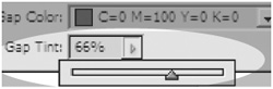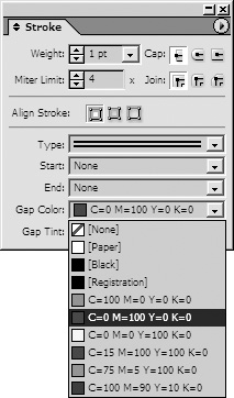 Use the Gap Color menu in the Stroke palette to set the color of the clear areas of a stroke.  Tip This list contains the same colors and gradients as the Swatches palette. | 3. | If necessary, use the Gap Tint controls to set a screen for the gap color .