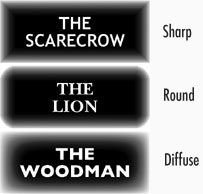 The three different corner settings for applying a feather effect.  Sharp feathers by closely following the contours of the object. Round feathers by rounding off any sharp corners in the image. Diffuse makes the edges of the object fade from opaque to transparent. This is the same as the Feather command applied to objects in Adobe Illustrator. | 6. | Use the Noise field to add grain to the feathering. This helps avoid banding when printing.