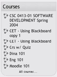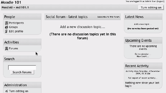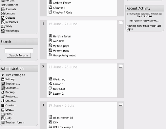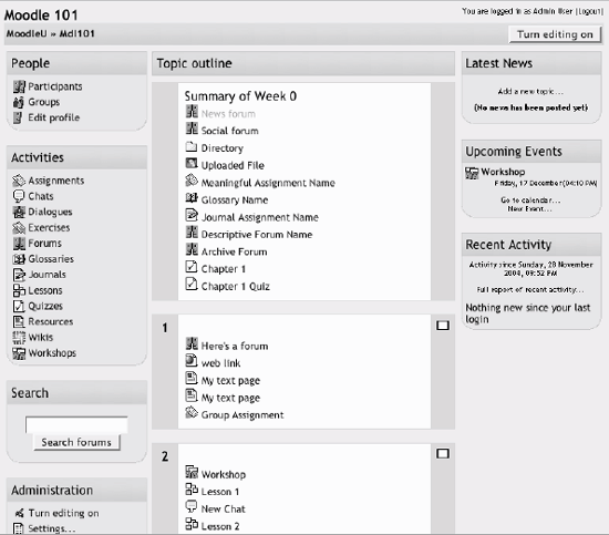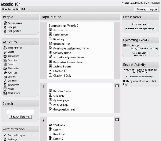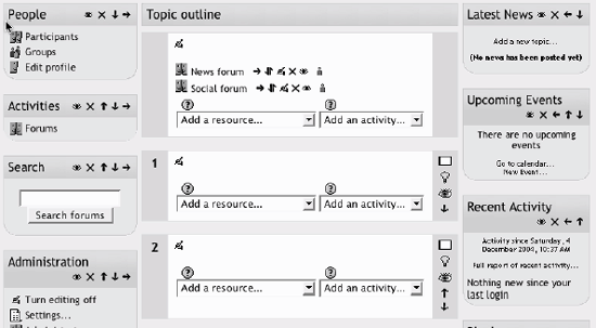2.3. A First Look at a Course On the left side of the main screen, you'll see a block that includes a list of all the courses you are teaching or taking as a student. You can access your courses by clicking on the course name in the block, as shown in Figure 2-8. Figure 2-8. Main screen course list  Let's start with the upper lefthand corner of the course screen, as shown in Figure 2-9. There you'll see the name of your course as entered when the course was created. Either your system administrator entered your course name by hand or she got it from your institution's course database. (Read the "Course settings" section below if you need to change the name.) Figure 2-9. Course layout  Below the course name is a bar that fills with the hyperlinked names of pages as you navigate from one page to another. Also known as "breadcrumbs," these links track where you are in the course and allow you to easily to find your way back to where you started or to return to a page. Frequently, the best way to return to the course main page is to click on the course ID in the breadcrumb trail. For example, in Figure 2-9, you would click on Mdl101 to go back to the course main page from another page in the course. Below the navigation bar are three columns, which are also shown in Figure 2-9. The far-left and far-right columns contain tool blocks, while the center block contains your course content and activities. The topmost tool block on the left is the People block. From here, you and your students can view the individual profiles of other participants in the course and check who is a member of student workgroups. Beneath the People block is the Activities block. As you add forums, quizzes, workshops, assignments, and other activities to your course, the activity types will be listed here. By clicking on the activity type, students can view all of the activities of that type that are currently available to them. For example, if you gave a quiz every week, each content block would list a quiz, and all of the quizzes would also be listed under the quiz link in the Activities block. Next in the column is the Search block. The single text-entry field currently allows only you or your students to search the forums. As I write this, a more general course search is currently under development. Below the Search block is the Administration block (see Figure 2-10), from which you can set your course options, manage your roster, perform backups of the course, and manage student grades. In this chapter, we'll cover the first two tools, "Turn editing on" and "Settings," and we'll cover the rest in detail as they arise throughout the book. Figure 2-10. Administration block  The far-right column contains three blocks that report on activity in the course. The Latest News block lists the latest items added to the News forum, such as important news stories that pertain to the subject you're teaching. The Upcoming Events block lists events you've created in the calendar, such as exams and holidays. At the bottom of the block are links to view the calendar and add new events. Finally, there's the Recent Activity block, which lists the recent forum postings and uploads by you and your students. The middle column is where the action is. This is where you add all of your content and activities, such as forums, quizzes, and lessons for students to access. Before we get to that, however, you need to make a choice about the format in which your course will be presented. 2.3.1. Course Formats Unlike some CMSs that force you into one format, Moodle provides you with a number of options for the general format of your course. You can choose to order your course chronologically by week, conceptually by topic, or socially with a big forum as the central organizing principle.