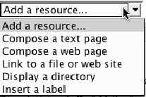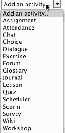 Insert a label You can use labels to organize the links in your course's main page. The only thing they do is provide a label within the content block. Figure 2-16. Resource menu  The Add Activity Menu, shown in Figure 2-17, allows you to add interactive tools to your course. The bulk of this book is dedicated to describing how each of these tools works and how to apply them in your course. Table 2-2 explains each tool very briefly. We'll learn more about these tools as they arise later in the book. Figure 2-17. Add Activity menu  Table 2-2. Activity typesTool type | Description |
