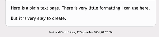 3.1. Adding Content to Moodle The first thing most people want to do when they create a course in Moodle is add some content, such as syllabus or a course outline. As I explained in Chapter 2, you can add content to your course using the "Add a resource" menu in the content blocks of your course (see Figure 2-16). In this chapter, we'll use all of the tools in the resource menu. Chapters 4,5,6,7,8,9,10,11-,12 will cover the tools in the "Add an activity" menu. Tip: Remember that you need to turn Editing Mode on to see the "Add a resource" and "Add an activity" menus. The first two tools, "Compose a text page" and "Compose a web page," can be used to develop content directly in Moodle. The second two, "Link to a file or web site" and "Display a directory," are used to manage content developed in other programs, such as Word or PowerPoint . You can also add content from other web sites and take advantage of the rich library of information available on the Web. Let's begin by creating a simple text page for your course. 3.1.1. Compose a Text Page A text page is a simple plain-text page with little formatting, such as the example in Figure 3-1. You can add paragraphs and whitespace, but that's about it. Figure 3-1. A text page in Moodle  Text pages are very easy to create, however. To create one: Turn Editing Mode on. From the "Add a Resource" menu, select "Compose a text page." Moodle will then display the page to compose a text page like the one in Figure 3-2. Figure 3-2. Compose a text page