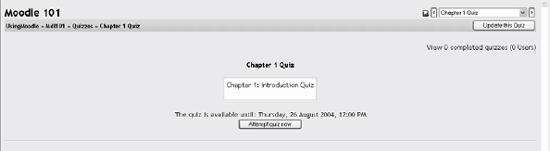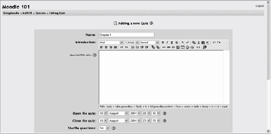 5.1. How to Create a Quiz Moodle quizzes have two major components: the quiz body and the question pools. Think of the quiz bodies as a container for various types of questions pulled from the question pools. The body is what students see when they take the assessment. It also defines how the students interact with the quiz. The questions in a quiz body can be of any type, chosen manually or at random, and displayed in a set order or a random order. The question pools can contain questions arranged in a manner that makes sense to you. You can create pools based on chapters, weeks in the semester, important concepts, or any other organizational scheme. Pools can be reused in multiple quizzes, shared between classes, and moved between systems. To start, we need to create a body for our first quiz. 5.1.1. Creating the Quiz Body When you create the quiz body, you are creating a container for the questions and setting the rules for interacting with the quiz. To create a quiz body: Click Turn Editing Mode On. Select Quiz from the add menu in the content section where you want to place the link to a quiz. In the Quiz editing page, shown in Figure 5-1, give the quiz a descriptive name. We'll call this first quiz "Chapter 1." Write an introduction for the quiz. Be sure to include any special instructions for taking the quiz, such as the number of attempts allowed or scoring rules. Choose opening and closing dates for the quiz. Warning: The default opening and closing dates are the same, and are set to the time you create the quiz. Be sure to change at least the closing date to some point in the future, or your students won't be able to take the quiz at all. Figure 5-1. Quiz editing
