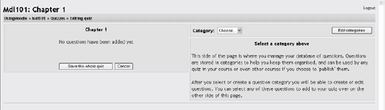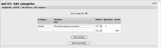 Require Network Address This option restricts access to the test to certain IP address ranges. If you want to require students to take a test from a certain lab on campus, set the network address range to cover the networks in the lab. For example, if you want to require access from computers with an IP range of 10.10.10.0 to 10.10.10.50, you would enter 10.10.10.0/50. To allow access from all computers in a subnet (say, on the campus), enter the partial address you want to use. Click the Continue button. Once you click the Continue button, you'll see the second editing screen where you will write and select questions to include in the quiz body. 5.1.2. Creating Questions for a Quiz You can create your quiz questions in the question-editing section. Here, you'll create and categorize your quiz questions and add them to the quiz body you just created. On the left side of the screen, as shown in Figure 5-2, you'll see a block where the questions you've added to the current quiz are displayed. Since this is a new quiz, there are no questions there, and Moodle tells us this. On the right side of the screen, you'll see a category selection menu labeled "Category" and a button labeled "Edit categories." Categories are used to organize your quiz questions for your course, and they can be a container for sharing questions between courses. By default, there is one category, called Default. If you click on the category menu, you'll see it as an option. Figure 5-2. Add questions  Tip: It's good practice to create categories to organize your questions. The level of detail in the categories is up to you, but I tend to lean toward more detailed categories I can combine into larger groups later if I want to. For example, I'll break down questions related to a reading into a couple of concepts. It's easier to clump questions together later than it is to pull them apart. Let's start out by making a category to hold our questions for our Chapter 1 quiz: From the Editingquiz page, click "Edit categories." At the bottom of the list of current categories, as shown in Figure 5-3, you will see a blank line. Figure 5-3. Edit categories  Type the name of your new question category in the first text box on the left. Add a description for your class in the category info area. If you'd like to share your question with the other classes on the server, select Yes in the Publish column. Click the Save Changes button at the bottom, If you want to add another category, a new blank line will appear at the bottom of the list. When you are done adding categories, click the "Back to quiz editing" button. This will take you back to the "Editing quiz" page. Once you've created your categories, it's time to add some questions: From the "Editing Quiz" page, select a category to which you want to add a question. The area below the category will display the question-creation block. Select the question type you want to create from the "Create new question" option:
