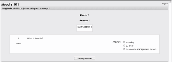 Embedded Answers (Cloze) A question with multiple questions embedded within it. The development of this module is not yet finished, so I'm not going to cover this type in depth. Fill in the form for the question type you are creating. Click Save Changes at the bottom of the form. Each question type has its own form and options. We'll spend the next few pages detailing the options for each question type. 5.1.2.1. Multiple-choice questions Moodle provides you with a lot of flexibility when creating this common question type. Figure 5-4 shows an example question. You can create single- and multiple-answer questions, display pictures in the question, and give relative grading weights to individual answers. To create multiple-choice questions: Figure 5-5 shows the multiple-choice question-editing page. Start by giving the question a descriptive name. You'll use the name to track your questions later, so "Question 1" isn't a good idea. Create the question text. If you're using the HTML editor, you can format the question just like a word-processing document. If you want to add an image to the question, you have two options: If you've already uploaded an image to your Files area (see Chapter 4 for details), it will be available to add to the question stem in a dropdown menu under the Question text area. If you're using the HTML editor, you can click the image icon. This will pop-up the Insert Image window. You can choose to upload an image into your Files area from this window or add the URL of an image on the Web. If you add a file to your Files area, click the name of the file after you upload it to insert the link into the URL text entry at the top of the screen. Then click OK.