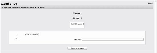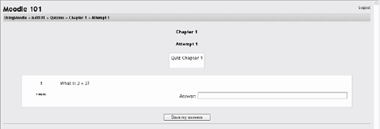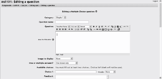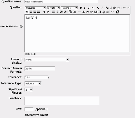 Fill in the response choices in the rest of the form. Any unused areas will be ignored. Select the Save Changes button at the bottom of the screen. Figure 5-4. A multiple-choice question  Figure 5-5. Editing a multiple-choice question  You have now added a multiple-choice question to the question category. 5.1.2.2. Short-answer questions Short-answer questions require the student to type an answer to a question, as shown in Figure 5-6. The answer could be a word or a phrase, but it must match one of your acceptable answers exactly. It's a good idea to keep the required answer as short as possible to avoid missing a correct answer that's phrased differently. Tip: I like to prototype my short-answer questions to catch common acceptable answers I hadn't thought of. To do this, start by creating a few acceptable answers and include the question in a quiz for no points. Be sure to tell students you are testing a new question. Once the quiz is over, review students' answers and add their acceptable answers to the list. Figure 5-6. A short-answer question  To create a short-answer question: Give your question a descriptive name. Create the question stem. If you want students to fill in a blank, use the underscore to indicate where the blank is. Select an image to display if you want to add a picture to the question (see step 3 in the previous section for more details). Choose whether capitalization is important. Case-sensitivity can be tricky. Will you accept "george Washington" as well as "George Washington" as an answer? Fill in the answers you will accept. Give each answer a percentage of the grade if required. You could give common misspellings partial credit with this option. Create feedback for each acceptable answer. Click Save Changes to add the question to the category. 5.1.2.3. Numerical questions Numerical questions are a lot like short-answer questions for equations such as the one shown in Figure 5-7. You can create a question with an equation, and your students type in a numeric answer. Students will get credit for answers within the range of answers you specify. Figure 5-7. Numerical question  To create a numerical question: Select Numerical question from the new question menu. Give the question a descriptive name. Type the equation or numerical question for your students to solve. Select an image to display if you want to add a picture to the question (see step 3 in the section "Multiple-choice questions" for more details). Tip: Moodle doesn't have a good equation editor (yet). So an image of an equation may be the best way to display it.