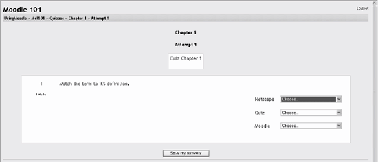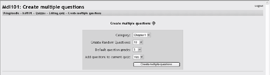 Enter the correct answer (you can add only one correct answer). Enter the accepted error, i.e., the range above or below the correct answer. For example, if the correct answer is 5, but you will accept 4 or 6 as answers, your accepted error is 1. Enter feedback for the question. If you want to accept answers in multiple units (e.g., metric or English units), specify the unit multiplier and the unit label in the areas. Click Save Changes to add the question to the category. 5.1.2.4. Matching questions Matching questions ask students to match multiple question stems to multiple possible answers (see Figure 5-8). They are useful for testing students' understanding of vocabulary and their ability to match examples to concepts. Setting up a matching question in Moodle is a bit different from setting up other types of questions. Figure 5-8. Matching question  To create a matching question: Select Matching question from the new question menu. Give the question a descriptive name. Enter the question stem to tell the students what they are matching. Select an image to display if you want to add a picture to the question (see step 3 in the section "Multiple-choice questions" for more details). For the first matching item, enter the question and a matching answer. Fill in at least three questions and answers. You can enter as many as 10 items. Click Save Changes to add the question to the category. Moodle will display the question in two columns. The first will contain the questions. The second will display a dropdown menu for each question with all possible matching answers as options. 5.1.2.5. Random questions A random question is a placeholder for a randomly selected question. One of the advantages of a computer-generated quiz is the ability to generate a quiz from questions randomly selected from a category. Each random question will pull a question randomly from the question category and insert it into the quiz whenever a student takes the quiz. Each random question can be inserted into a quiz only once, so you'll need to create a random question for each question you want randomly inserted into the quiz. Fortunately, it's easy to create a random question or even a bunch of them at once. To create a random question: Select "Random question" from the new question menu. Give the question a descriptive name. Click Save Changes to add the question to the category. To create multiple random questions: Click the Create multiple questions button below the new question menu. Select the number of questions you want to create on the screen shown in Figure 5-9. Figure 5-9. Create multiple questions