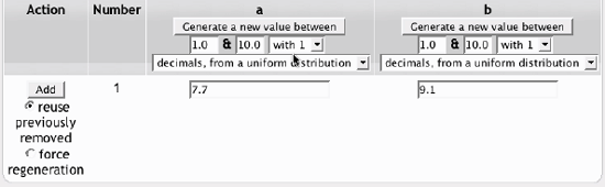 Enter your question into the question field. All variables you want Moodle to replace with generated values must be placed in curly braces. Enter the formula for the answer. Be sure to use the same placeholders so Moodle can substitute the same values. Determine the tolerance for error that you will accept in the answer. The tolerance and tolerance type combine to give a range of acceptable scores. Select the number of significant figures you want in the correct answer. If you want, type some feedback for the student. Enter the units for the answer (e.g., meters, kg., ft., etc.). Moodle will look for the correct units. If you want to enter other acceptable units, such as metric versus English distances, enter them along with a conversion factor. Click Save Changes. On the next screen, choose whether to create substitution values for each placeholder only for this question, or for other questions in the same category. Click Save Changes. Create a dataset for the question or questions in the category. For each placeholder, generate a series of acceptable values. The more values you generate, the more a question can be used without repeating values. Figure 5-11 illustrates the interface for datasets for calculated questions. Figure 5-11. Calculated question dataset