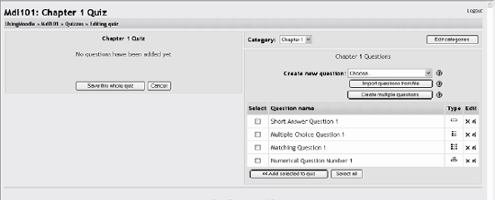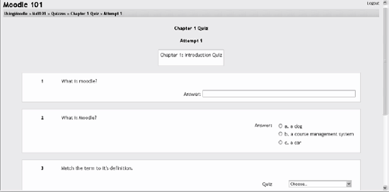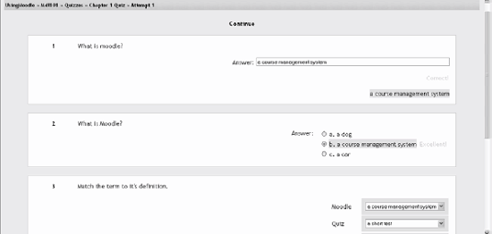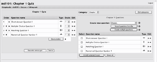 Embedded answers (Cloze) The Cloze format is a multiple-answer question with embedded answers. These questions can be a bit tricky to develop, but they are a unique way of asking questions. Click the help button next to the Import File button for more details about each format. 5.1.4. Adding Questions to a Quiz Once you've created your questions, you'll need to add them to the quiz. The buttons at the bottom of the question are used to add questions to the quiz. You can select individual questions using the checkboxes on the left of the question list. Select the individual questions and click the "Add selected to quiz" button at the bottom of the list, as shown in Figure 5-12. If you want to add all of the questions you created to the quiz, click the "Select all" button and then click the "Add selected to quiz" button. Once you've added a question to the quiz, it appears on the left side of the screen in the quiz question list. The question is still selectable on the right, but you can add it to the quiz only once. If you select the question in the category list again and add it to the quiz, nothing will happen. Figure 5-12. Quiz editing screen  Once you've added the questions to the quiz, you can change the order of the questions by clicking the arrow buttons on the left side of the list of quiz questions (see Figure 5-13). Figure 5-13. Editing quiz with questions  You will also need to set the grade for each question. You can set the number of points for each question in the dropdown menu in the Grade column. You may want to make certain questions or question types worth more than others. Remember, the questions will be weighted to match the total points possible for the quiz you set in the quiz body. When you're done, click "Save this whole quiz." You'll then be taken back to your course's main page. If you click on the quiz link from the content block, you'll see the quiz intro page. You can preview the quiz by clicking on the "Attempt quiz now" button. Figures 5-14 and 5-15 show the quiz as your students will see it Figure 5-14. Quiz introduction  Figure 5-15. Quiz attempt  If you answer the questions, you can submit the quiz and see the feedback and responses your students will see. Your students will see two scores at the top of the page. The first is the raw score representing the total points they scored out of the maximum possible points from each question. The second score is the weighted score representing the number of points out of the maximum possible points for the quiz. If you've enabled feedback after answering, each question will be displayed below the scores with the answers marked correct or incorrect, as shown in Figure 5-16. If you've enabled the display of correct answers, they will appear highlighted in green. Figure 5-16. Quiz results  Your preview scores will be recorded with the students' attempts. In the next section, we'll discuss how to manage your quizzes. |