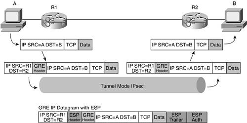 When transport mode ESP IPsec and GRE are combined, fragmentation can be fairly complex. Figures 10-20 and 10-21 show a packet with the DF not set and another with the DF bit set.