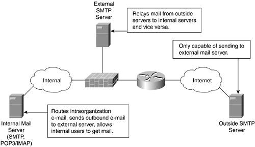 As shown in this design, Simple Mail Transfer Protocol (SMTP) servers outside the organization send mail to the external SMTP server, which in turn routes the messages to the internal mail server. This external server is also configured to allow the internal mail servers to route messages through it by using SMTP. In this way, the external mail server is the source of all internal and external mail for the organization. SMTP can be blocked at the firewall to prevent any other systems from sending mail using SMTP.