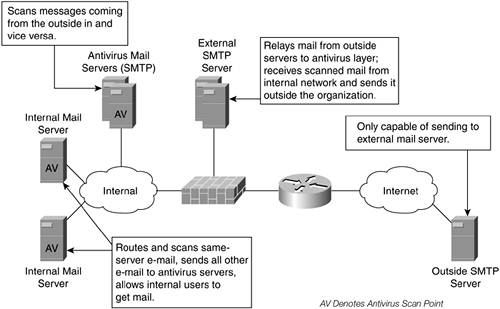 Designing network security for e-mail centers on separating inbound and outbound mail and providing for network virus scanning. This separation is made both for security and to ensure quick delivery of messages without requiring internal users to go outside for mail messages or external senders to come inside the firewall to deliver mail. Network antivirus (in the form of server-based e-mail filtering) is strongly recommended for e-mail because e-mail is the most common infection point for viruses. In the event that a new virus attacks your systems, you can update the signatures on the mail servers quickly to stop further infection. In addition to stopping virus spread internally, antivirus protection prevents the virus from attacking other networks through your systems. Without antivirus filtering on the e-mail servers, you must update the signatures on each and every host, lengthening the process and increasing the risk that serious damage can be done before you are able to stop it.