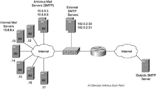 After showing the two sample designs, it is useful to see how these topologies translate into specific access control rules to enforce the policy. Figure 8-3 shows a topology that uses the distributed design as a base and assumes six internal mail servers, two antivirus servers, and two external mail servers.